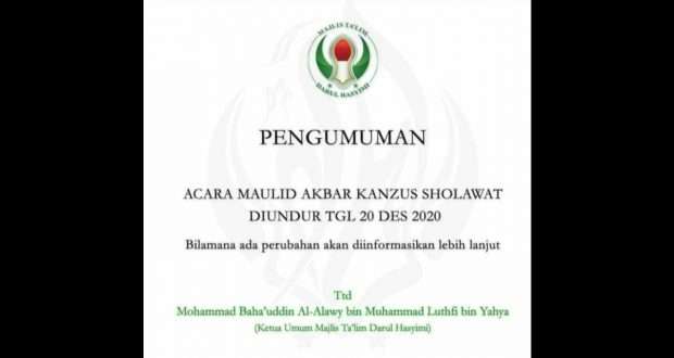 KOTA PEKALONGAN – Setelah menjadi sorotan dan perbincangan, terlebih pencopotan dua kapolda karena dianggap lalai dalam menegakan protokol kesehatan, ahirnya Habib Luthfi bin Yahya memutuskan untuk menunda rangkaian acara maulid akbar di Kanzus Sholawat yang semula akan digelar 18-22 November, direncanakan kembali alias diundur jadi tanggal 20 Desember 2020 mendatang. Habib Luthfi mengumumkan sendiri pengunduran acara tersebut.
