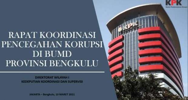 KPK mulai menyasar Badan Umum Milik Daerah (BUMD) guna mendorong upaya pencegahan korupsi di internal BUMD, di antaranya adalah BUMD yang dimiliki Pemerintah Provinsi Bengkulu melalui rapat koordinasi pencegahan korupsi secara daring, 10 Maret 2021.