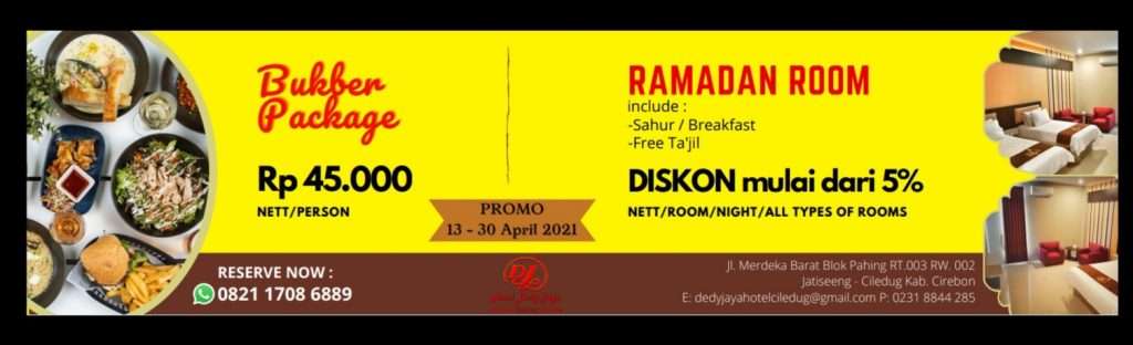 CIREBON – Menyambut bulan Ramadhan 1442H, Dedy Jaya Hotel di Desa Jatiseeng, Kec Ciledug, Kab Cirebon, menawarkan promo keren untuk berbuka puasa di hotel. Promo istimewa ini dimulai pada 13 – 30 April 2021.