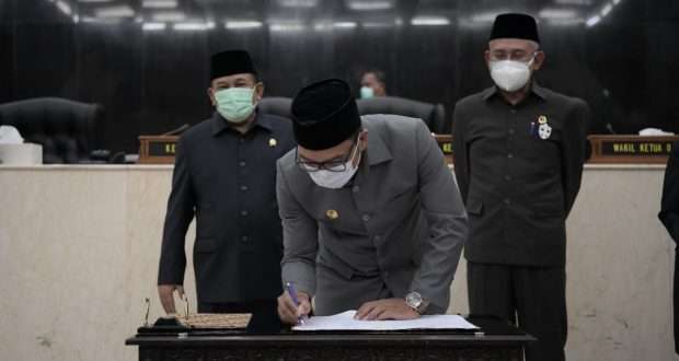 Penandatanganan berlangsung dalam Rapat Paripurna DPRD Jabar tentang CDPOB Kabupaten Bogor Timur dan Kabupaten Indramayu Barat, dan Persetujuan Rencana Kerja Sama Luar Negeri di Gedung DPRD Jabar, Kota Bandung, Jumat (16/4/2021).