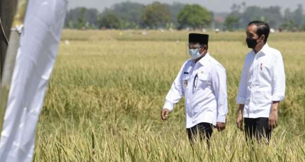 KAB. INDRAMAYU – Wakil Gubernur (Wagub) Jawa Barat (Jabar) Uu Ruzhanul Ulum mendampingi Presiden RI Joko Widodo meninjau aktivitas panen padi di Desa Wanasari, Kabupaten Indramayu, Rabu (21/4/2021).