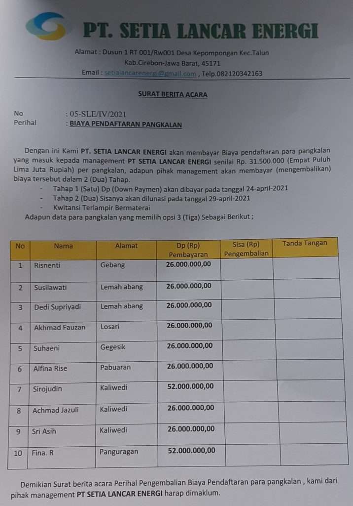 “Intinya kami menuntut hak kami, uang sebesar Rp 45 juta yang kami titipkan saat pendaftaran itu dikembalikan seutuhnya. Ini sudah ke sekian kali kami ke sini dan dijanjikan, tapi belum ada realisasi,” tegas Amir, Pemilik pangkalan di Desa Gebangkulon mendampingi istrinya Risnenti, Sabtu sore.