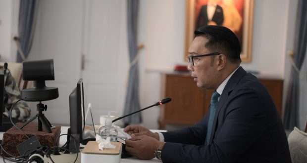KOTA BANDUNG – Gubernur Jawa Barat (Jabar) Ridwan Kamil menghadiri Halal bi Halal bersama Otoritas Jasa Keuangan (OJK) Provinsi Jabar dan Kantor Perwakilan Bank Indonesia Jabar via konferensi video di Gedung Pakuan, Kota Bandung, Jumat (21/5/2021).