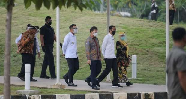 Presiden bersama rombongan meninjau vaksinasi massal di parkiran rumah sakit. Di tempat ini warga divaksin lewat beberapa metode yakni drive thru (tanpa turun kendaraan) dan walk in tempat kepada driver dan ojek online.