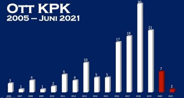 Sementara itu, berdasarkan grafik operasi tangkap tangan (OTT) yang diperoleh redaksi JP dari salah seorang penyidik di KPK, terlihat jelas bahwa dari tahun ke tahun jumlah OTT terus-menerus turun bahkan drastis. Di sana tertulis pada tahun 2018 sebanyak 30 kasus OTT, 2019 sebanyak 21 kasus, 2020 yakni 7 kasus dan pada tahun 2021 tepatnya hingga bulan Juni ini hanya 2 kasus.