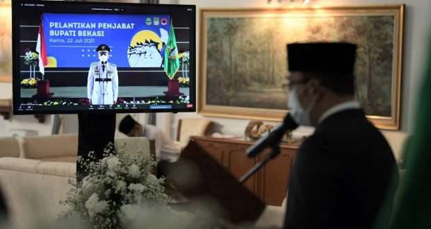 KOTA BANDUNG – Gubernur Jawa Barat (Jabar) Ridwan Kamil melantik Kepala Pelaksana Badan Penanggulangan Bencana Daerah (BPBD) Jabar Dani Ramdan sebagai Penjabat (Pj) Bupati Bekasi via konferensi video dari Gedung Pakuan, Kota Bandung, Kamis (22/7/2021).