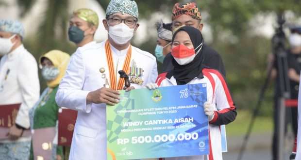 PERAIH medali perunggu Olimpiade Musim Panas Tokyo 2020 dari angkat besi, Windy Cantika Aisah terlihat semringah saat hadir di Gedung Sate Bandung untuk menerima kadeudeuh dari Gubernur Jawa Barat Ridwan Kamil.