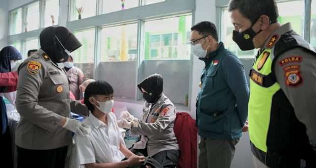 Siswa terlihat antusias menerima vaksin COVID-19. Kang Emil menuturkan, penanganan pandemi COVID-19 di Jabar relatif membaik. Tidak ada daerah di Jabar yang masuk PPKM Level 4. Selain itu, 11 daerah sudah berada di level 2. PTM pun digelar di sejumlah daerah dengan menerapkan adaptasi kebiasaan baru.