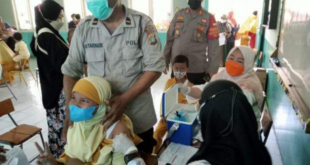 “Pemberian vaksinasi massal dosis pertama pada giat vaksin Merdeka Berani dan Bhakti Kesehatan Bhayangkara untuk Negeri, Polsek Serang Baru bekerjasama dengan Puskesmas Serang Baru, Muspika Serang Baru, dan Kepsek SD MIP, SDIT Izzatul Islam, dan SD Anugerah,” tutur Kapolsek Serang Baru, AKP Somantri.