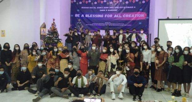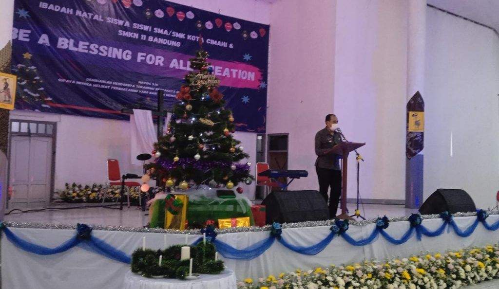CIMAHI – Letkol. Inf. Purn. Ngatiyana sebagai Pelaksana Tugas (Plt) Walikota Cimahi menghadiri Perayaan Natal Siswa-Siswi SMA/SMK se-Kota Cimahi dan SMKN 11 Bandung di Aula GPIB Immanuel Cimahi, Jumat, 7/1/2022. Ia bersama beberapa pejabat Kota Cimahi berbaur bersama peserta Natal usai sesi acara Ibadah Natal dan masuk pada sesi acara perayaan Natal. Kegiatan ini dilaksanakan dengan menerapkan protokol kesehatan yang ketat. Seratusan peserta Natal ini mengenakan masker dan susunan kursi pun diberi jarak.