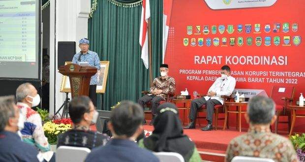 KOTA BANDUNG – Gubernur Jawa Barat Ridwan Kamil berkomitmen memperbaiki Indeks Pemberantasan Korupsi dengan tindakan pencegahan dari dalam pemerintahan. Kang Emil sapaan akrabnya, menyampaikan hal ini saat menghadiri Rapat Koordinasi Program Pemberantasan Korupsi Terintegrasi Kepala Daerah se-Jawa Barat Tahun 2022 di Gedung Sate, Kota Bandung, Kamis (10/3/2022).