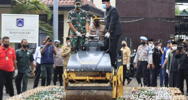 BEKASI – Polres Metro Bekasi Kota bersama KODIM 0507/Bekasi dan Pemerintah Kota Bekasi musnahkan sitaan barang bukti berupa minuman keras, sabu, ganja, dan gorila di halaman Mapolres Metro Bekasi Kota, Jumat (01/04/2022).