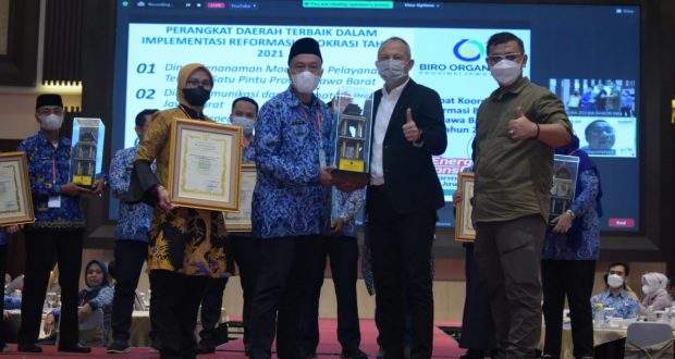Pada kesempatan ini Sekda Jabar berkesempatan menyerahkan anugerah pada Perangkat Daerah Terbaik dalam Implementasi Reformasi Birokrasi Tahun 2021, berdasarkan Surat Keputusan Gubernur Jawa Barat No 002.6/Kep.856.BKD/2021. Intansi berprestasi:
