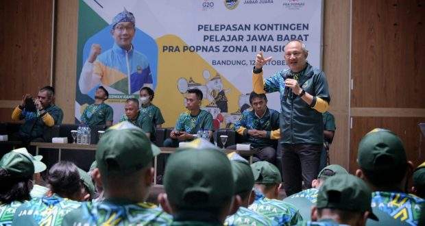 KOTA BANDUNG — Sekretaris Daerah Provinsi Jawa Barat Setiawan Wangsaatmaja melepas kontingen Jabar Pra Pekan Olahraga Pelajar Nasional (POPNAS) Zona II Nasional di Kantor Dinas Pemuda dan Olahraga Provinsi Jabar, Kota Bandung, Rabu (12/10/2022).