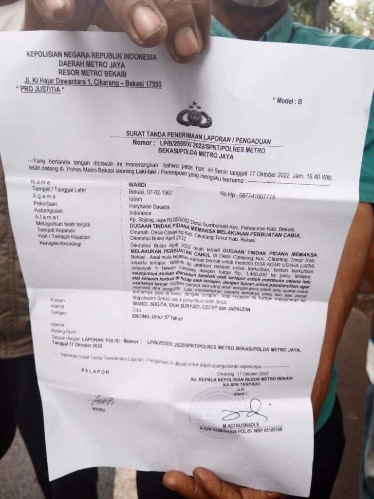 BEKASI – Lima pria paruh baru di Kabupaten Bekasi menerima perlakuan seks menyimpang dugaan tindak pidana memaksa melakukan perbuatan cabul oleh Dukun tua (sesama jenis-red) dengan dalih persyaratan untuk penglaris. Kejadian ini terjadi di rumah terlapor di Desa Cipayung, Kecamatan Cikarang Timur, Kabupaten Bekasi pada bulan April 2022.