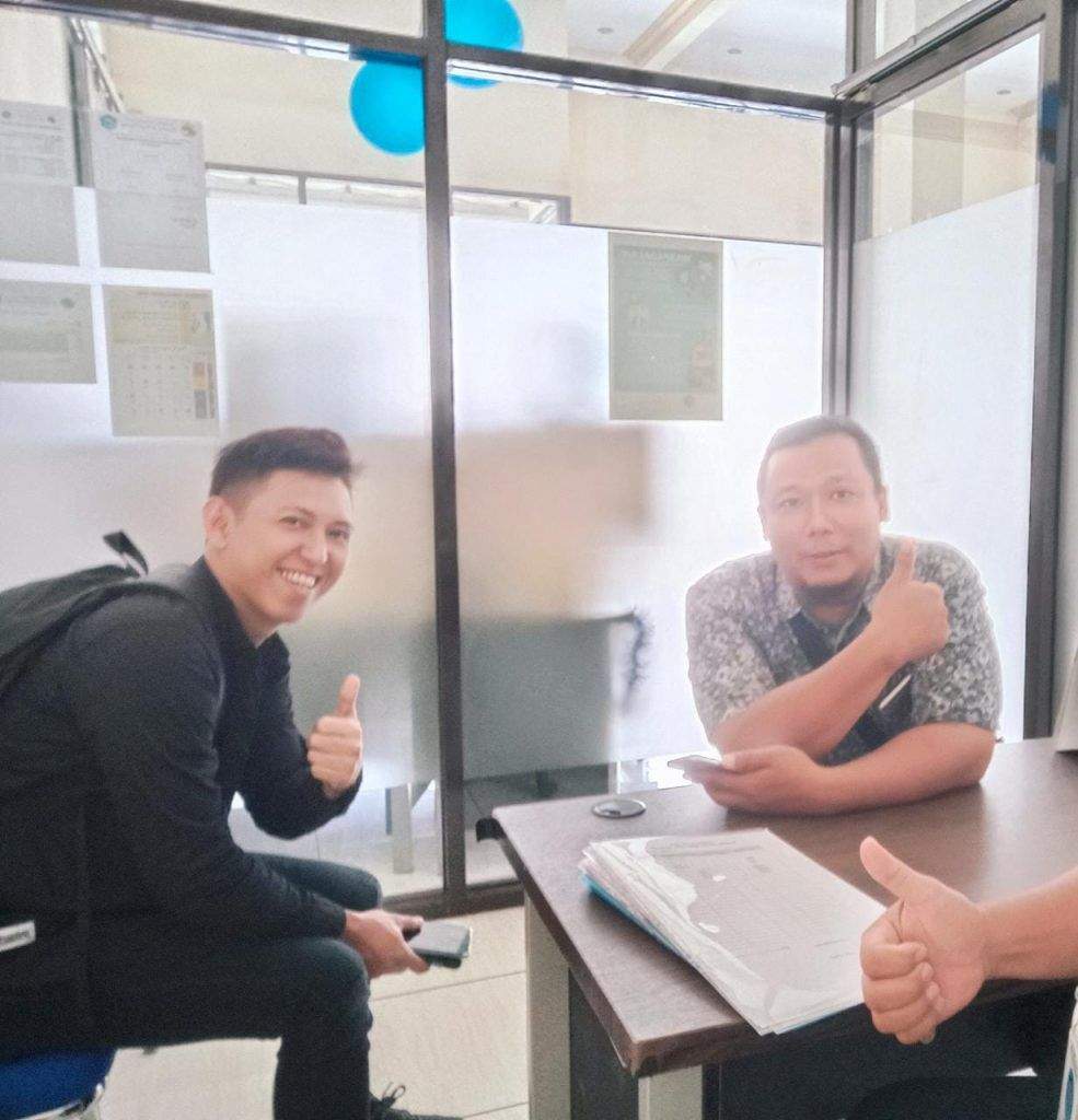 DICROP – Kepala Cabang KSP BAP Pabuaran justru memotong (meng-crop) fotonya sendiri dan hanya memperlihatkan tangan dan jempolnya saja. Padahal dia yang meminta foto selfie sebagai bahan laporan ke Kantor Pusat. Tampak pada gambar: Ruswa Adi Putra wartawan JP (kanan).