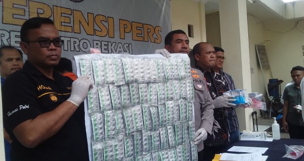 BEKASI – Polres Metro Bekasi dengan Sat Res Narkoba Polres Metro Bekasi merilis pengungkapan perkara yang menonjol bahan berbahaya jenis obat daftar “G” di halaman balai Humas Polres Metro Bekasi Jalan KH Dewantara No.1, Kecamatan Cikarang Utara, Kabupaten Bekasi, Jumat (24/03/2023) siang.