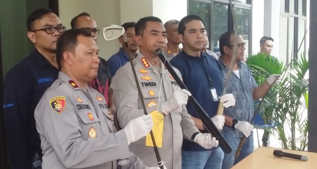 “Untuk barang bukti bisa dilihat di atas meja, ini ada senjata tajam sudah dimodifikasi, celurit kemudian ada stick golf, tongkat pemukul baseball untuk digunakan,” tambah Twedi.