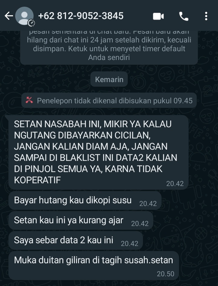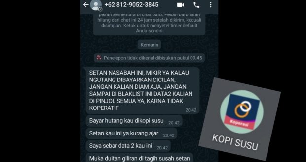 “Yang membuat saya jengkel adalah pola penagihannya sangat kasar dan tidak beretika cenderung mengintimidasi dan mengancam. Padahal saat itu saya belum telat. Hari ini sudah saya bayar dan segera saya uninstal. OJK, AFPI dan Mabes Polri tolong segera ditindak pinjol ini,” tegas Sumber JP sambil menunjukkan bukti penagihan yang kasar dari DC Pinjol Kopi Susu.
