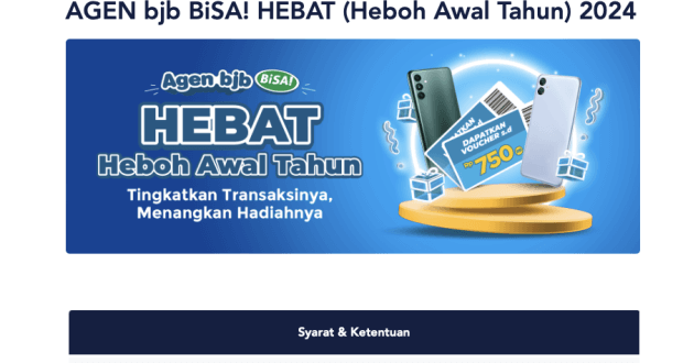 MEMASUKI awal tahun 2024, bank bjb membuat gebrakan menarik yang diperuntukkan bagi para agen bjb BiSA di seluruh Indonesia. Program bernama Agen bjb BiSA! HEBAT ini berupa apresiasi hadiah menarik bagi agen yang mencatat transaksi spektakuler sepanjang Januari 2024.