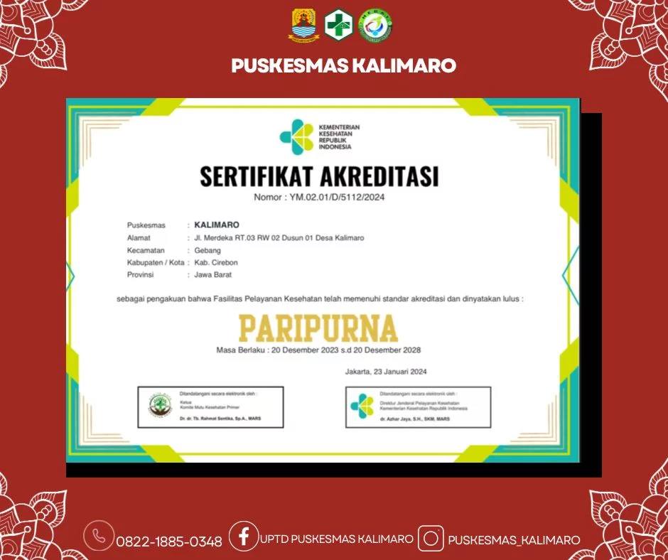 CIREBON – UPTD Puskesmas Kalimaro, Kec Gebang, Kab Cirebon, sukses meraih predikat “Paripurna” dalam agenda re-akreditasi yang dilaksanakan oleh Kementerian Kesehatan Republik Indonesia (Kemenkes RI) tahun 2023.