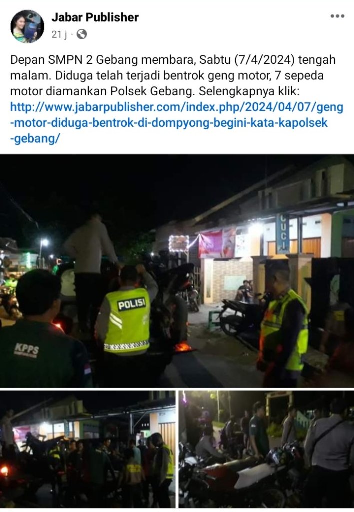 Setelah mendapat aduan tersebut, para petugas pun langsung datang ke TKP, sedangkan si pelapor justru pergi pulang dan tidak ikut ke lokasi. Para petugas langsung datang ke lokasi tempat para pemuda yang tengah nongkrong-nongkrong. Namun niat hati hanya sekedar ingin bertanya memastikan apa yang terjadi, para pemuda terduga geng motor itu malah langsung lari tunggang langgang dan meninggalkan sepeda motor mereka. Lalu datanglah jajaran Polsek Gebang yang mengangkut sepeda motor mereka secara bertahap. Tak lama berselang, kejadian pun langsung viral usai foto pasca insiden itu di share via Fanspage Facebook Jabar Publisher. (jay/adi)