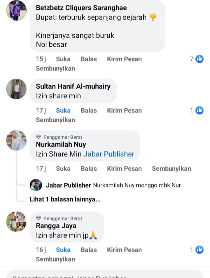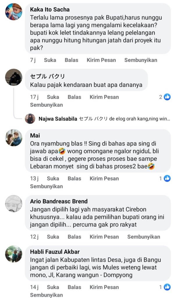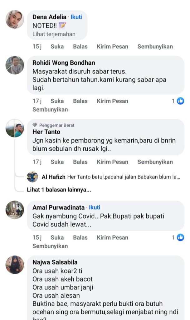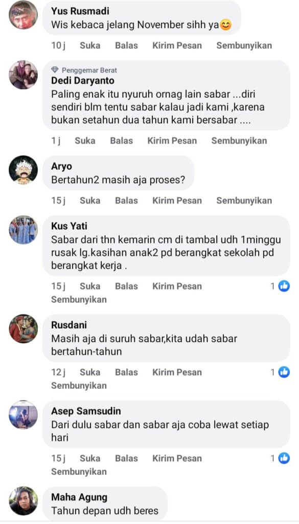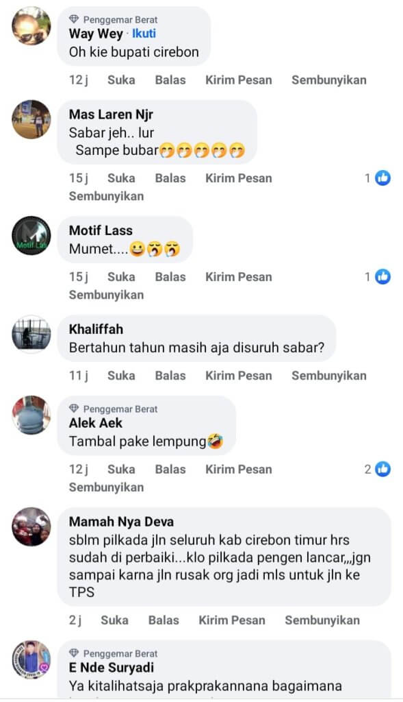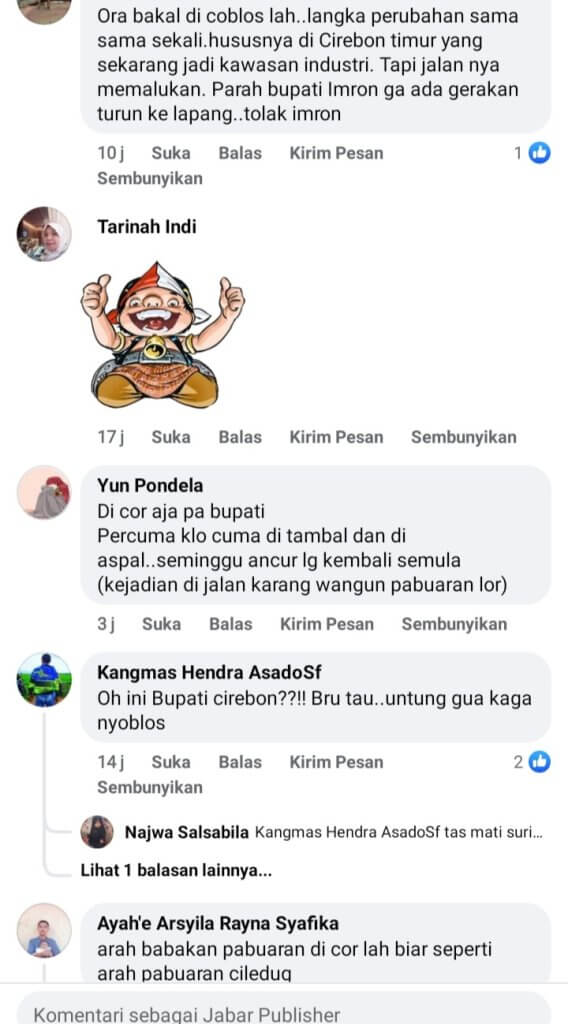 Berikut beberapa komentar pembaca JP terkait statment Kang Imron soal rencana perbaikan jalan rusak di fanspage Jabar Publisher: