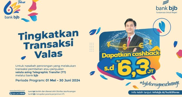 BANDUNG – Dalam semangat merayakan hari ulang tahunnya yang ke-63, bank bjb menghadirkan berbagai program istimewa, yaitu Promo Cashback bjb Foreign Exchange.
