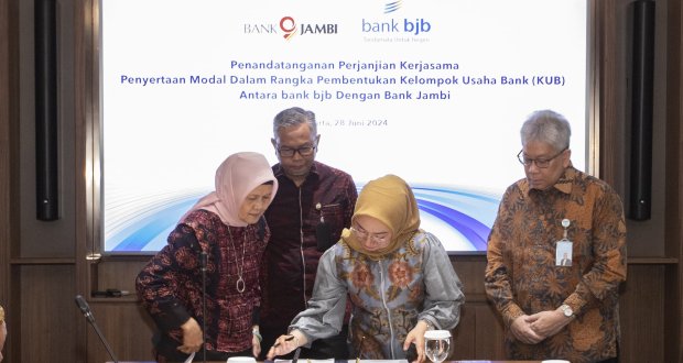 penandatanganan Perjanjian Kerja Sama (PKS) penyertaan modal dengan Bank Jambi. Acara ini berlangsung di bjb T-Tower, Jakarta, pada Jumat (28/6) dan dihadiri oleh Direktur Utama bank bjb Yuddy Renaldi, Direktur Keuangan bank bjb Hana Dartiwan, Direktur Komersial & UMKM bank bjb, Nancy Adistyasari, Direktur Utama Bank Jambi, Khairul Suhairi, Komisaris Utama Bank Jambi, Emilia, Komisaris Independen Bank Jambi, Rahayu dan Komisaris Independen Bank Jambi,