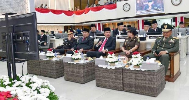 KOTA BANDUNG – Penjabat Gubernur Jawa Barat Bey Machmudin bersama para kepala perangkat daerah dan anggota DPRD Jabar mendengarkan pidato kenegaraan Presiden RI dalam rangka HUT ke – 79 Republik Indonesia, di Gedung DPRD Jabar, Jumat (16/8/2024).