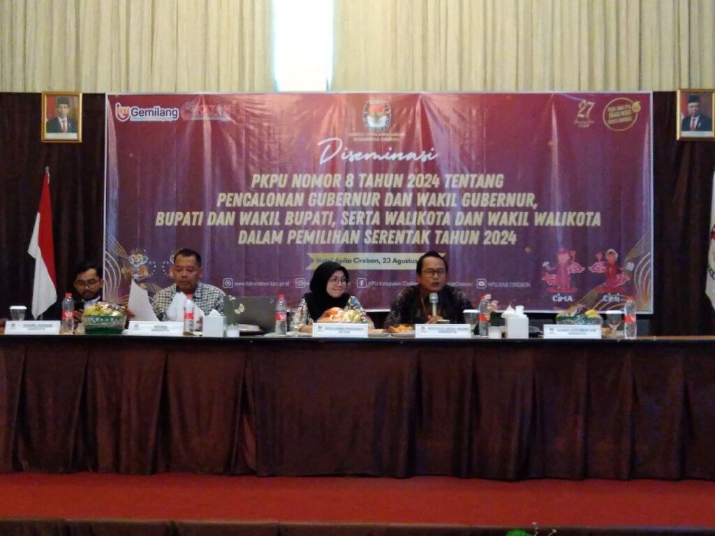 CIREBON – Perhelatan Pemilihan Kepala Daerah (Pilkada) Kabupaten Cirebon sebentar lagi akan digelar, tepatnya pada 27 November 2024. Menyambut hajat demokrasi 5 tahunan itu, Komisi Pemilihan Umum (KPU) Kabupaten Cirebon menggelar kegiatan Diseminasi Peraturan Komisi Pemilihan Umum (PKPU) Nomor 8 Tahun 2024, yang mengatur tentang pencalonan Gubernur dan Wakil Gubernur, Bupati dan Wakil Bupati, serta Walikota dan Wakil Walikota.