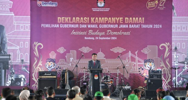 KOTA BANDUNG – Penjabat (Pj.) Gubernur Jawa Barat Bey Machmudin mendeklarasikan Damai Pemilihan Gubernur dan Wakil Gubernur Jawa Barat Tahun 2024 di Laswi Heritage, Kota Bandung, Selasa (24/9/2024).