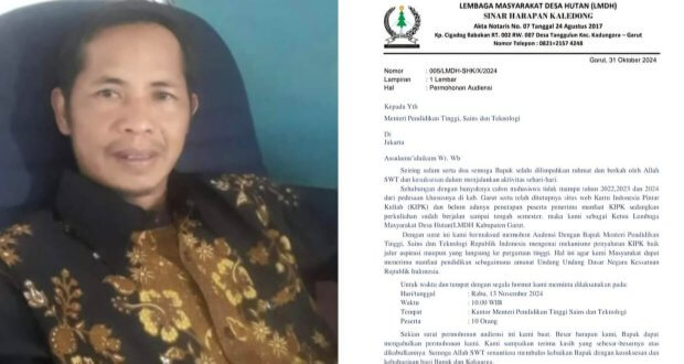GARUT – Lembaga Masyarakat Desa Hutan (LMDH) Sinar Harapan Kaledong (SHK) menerbitkan Surat Permohonan Audiensi dengan nomor surat: 005/LMDH-SHK/X/2024 yang dilayangkan kepada Kementerian Riset, Teknologi dan Pendidikan Tinggi Republik Indonesia (Kemenristekdikti RI). Surat berlampir 1 lembar tersebut diterbitkan di Garut pada tanggal 30 Oktober 2024, yang ditanda tangani oleh Ketua LMDH-SHK, Koko Ali Permana, S.Pd. MM.
