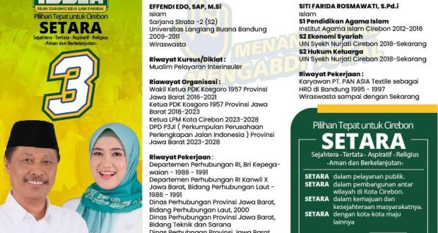 Sedangkan paslon nomor urut 3, yakni Effendi Edo dan Siti Farida Rosmawati, berjanji akan mewujudkan pemerintahan yang partisipatif dan kolaboratif. Paslon nomor 3 juga berjanji akan meluncurkan program sekolah tanpa pungutan, dan program kartu pendidikan untuk mewujudkan SDM Kota Cirebon yang unggul.