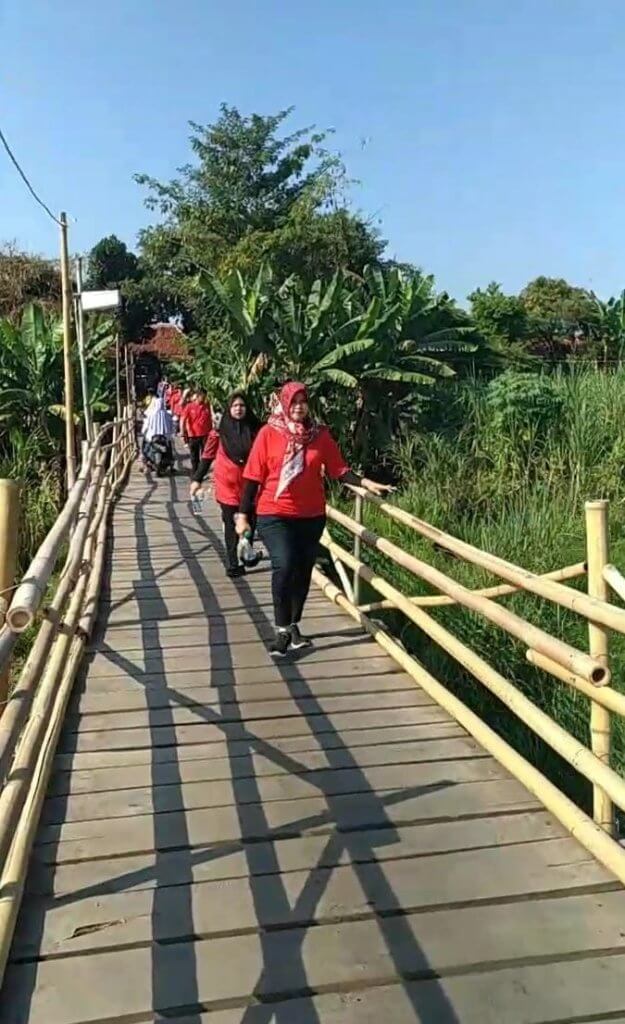 Peserta jalan santai melewati jembatan kayu sungai Cisanggarung