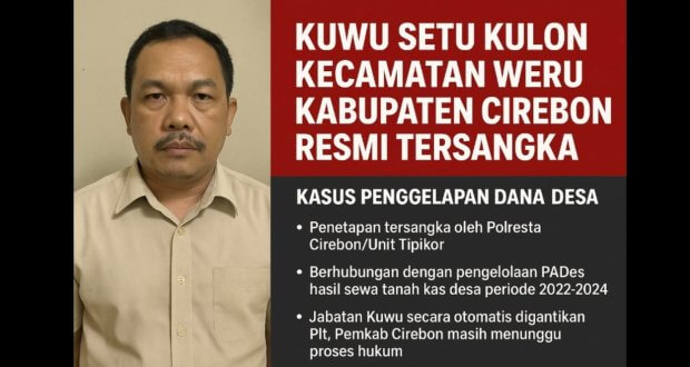CIREBON — Kepala Desa (Kuwu) Desa Setu Kulon, Kecamatan Weru, Kabupaten Cirebon, Joharudin, telah resmi ditetapkan sebagai tersangka atas dugaan penggelapan dana desa oleh penyidik Unit Tipikor Polresta Cirebon pada 20 Oktober 2025. Informasi resmi disampaikan melalui nota dinas yang diterima oleh Dinas Pemberdayaan Masyarakat dan Desa Kabupaten Cirebon.