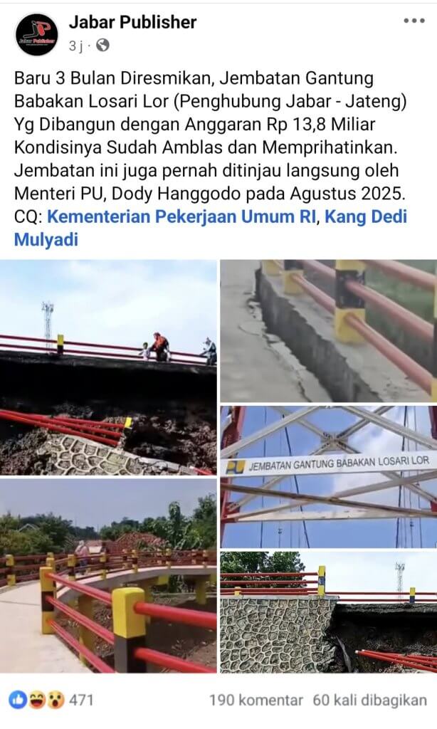 Dari foto yang diunggah Jabar Publisher, terlihat bagian pondasi penopang dan badan jalan di sisi jembatan mengalami keretakan parah hingga longsor. Dalam hitungan tiga jam setelah diposting, ratusan komentar netizen langsung membanjiri unggahan tersebut. Banyak yang mempertanyakan kualitas pekerjaan karena infrastruktur yang dibangun dengan anggaran APBN Rp13,8 miliar itu baru selesai dikerjakan pada akhir Juni 2025.