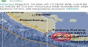 BANDUNG – Sukabumi diguncang gempa, Selasa (10/3/2020) sore. Dilansir dari akun Twitter BMKG, gempa bumi itu bermagnitdo 5,0. Gempa bumi terjadi pukul 17.18.05 WIB. “Lokasinya 13 kilometer timur laut dari Kabupaten Sukabumi. Pusat gempa ada di kedalaman 10 kilometer,” tulis akun tersebut. Meski demikian, gempa bumi di Kabupaten Sukabumi tersebut tak berpotensi tsunami. Dari gempa tersebut, beberapa daerah merasakan guncangan ...