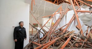 KOTA BANDUNG — Sekretaris Daerah Provinsi Jawa Barat Herman Suryatman meninjau Gedung Pusat Kebudayaan di Jalan Naripan, Kota Bandung, yang atapnya roboh di bagian depan bangunan pada Senin (28/10/2024). Saat kejadian, gedung dalam kondisi ramai dipergunakan sebagai lokasi pameran seni lukis. Menjelang aktivitas pameran berakhir, sekitar pukul 17.30 WIB, atap roboh di bagian depan bangunan yang digunakan sebagai ruang galeri. ...