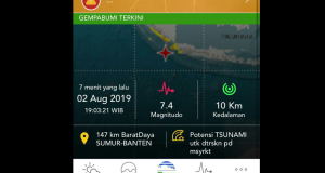 BANTEN – Warga Jakarta dan sekitarnya, Jumat (2/8/2019) malam ini, sekitar pukul 19:00 merasakan getaran gempa yang berpusat di Banten. Kekuatan gempa menurut BMKG sebesar 7,4 skala richter. Gempa berlokasi pada 7.54 Lintang Selatan, 104.58 Bujur Timur atau pada 147 km Barat daya Sumur, Banten, dengan kedalaman 10 kilometer. Gempa berpotensi tsunami. Getaran gempa di Banten ini dirasakan hingga ke ...