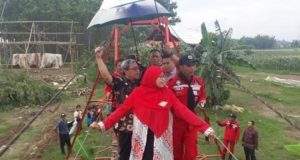 CIREBON – Gubernur Jawa Barat Ahmad Heryawan (Aher) beserta istri Netty Heryawan dan rombongannya mengunjungi Jembatan Gantung (Jemtung) yang ada di atas Sungai Cisanggarung di Desa Ciledug Wetan, Kecamatan Ciledug, Kabupaten Cirebon, Jumat (1/12).
